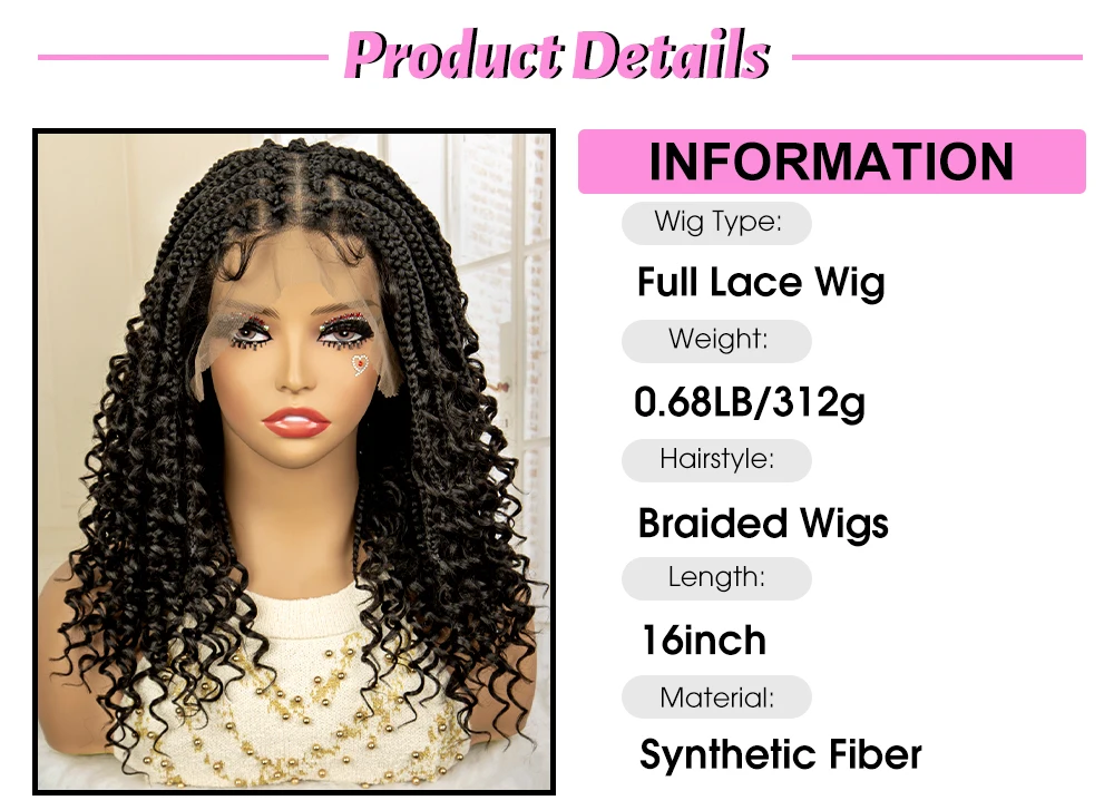 Braids SENSE 16 Inches Synthetic Full Lace Square Knotless Box Braided Wigs with Curly Boho Braids Wig with Baby Hair for Black Women