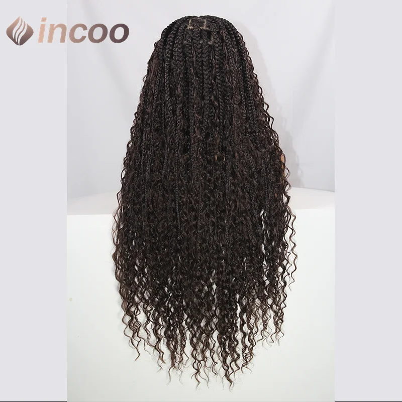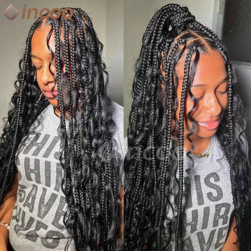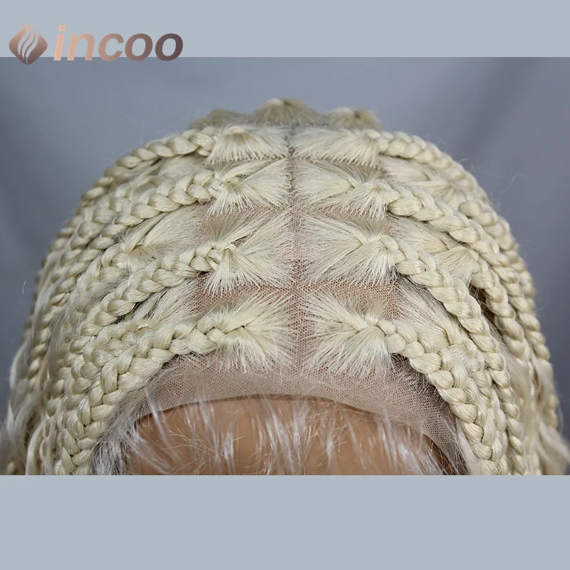32" Blonde Colored Full Lace Braided Wigs Bohemia Box Braids Synthetic Lace Frontal Wigs Deep Wave Goddess Braids Wig Curly Ends